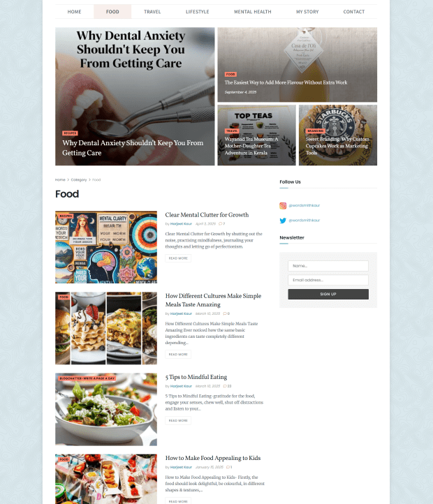 WordSmithKaur is a content-driven personal brand built around long-form storytelling across food, travel, lifestyle, and mental health. As the blog expanded, the website accumulated UX, structural, and technical challenges that began impacting mobile readability, navigation clarity, and overall reader trust. The growing content library needed better organization and a mobile-first experience to support long-form reading without disrupting existing content or SEO performance.